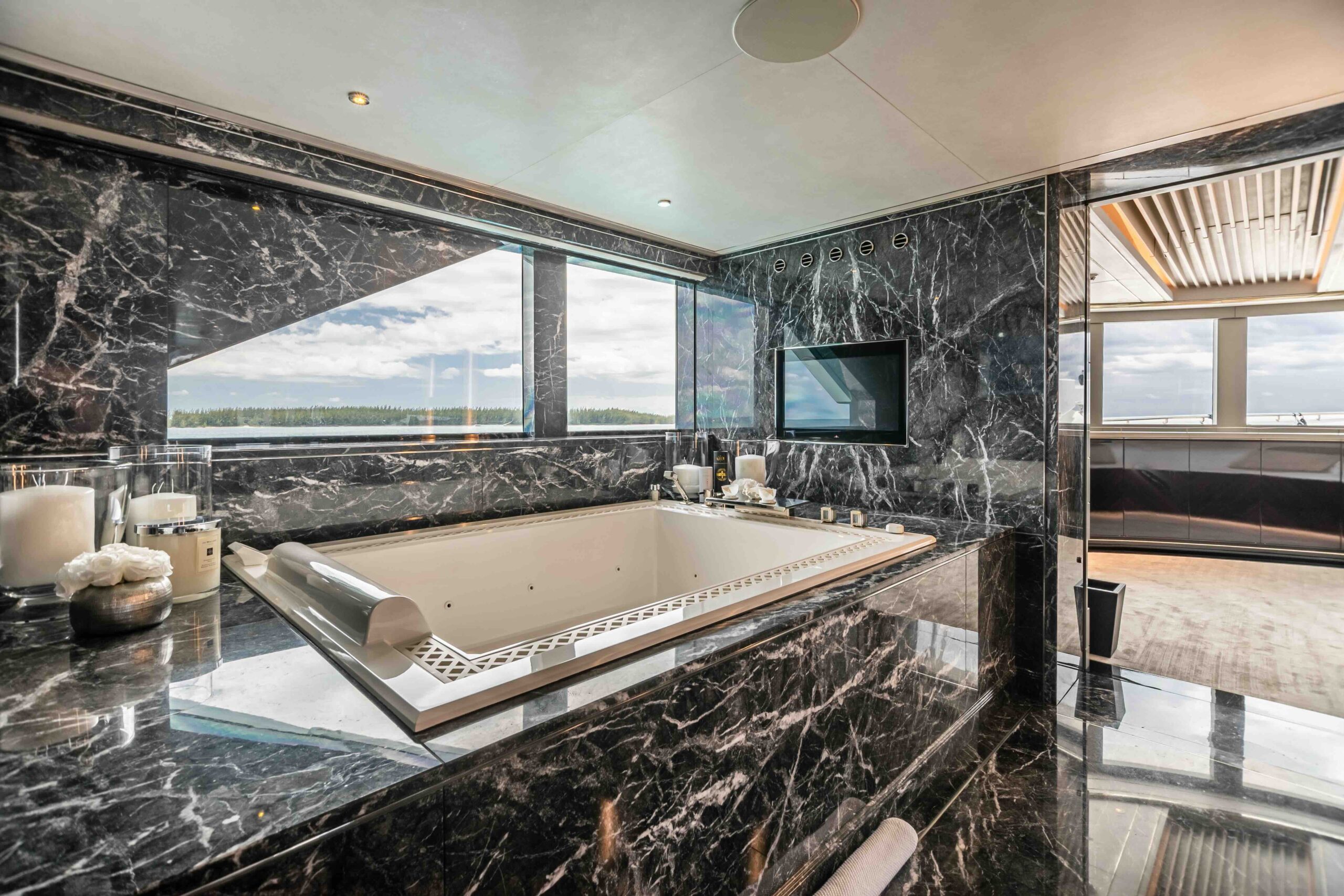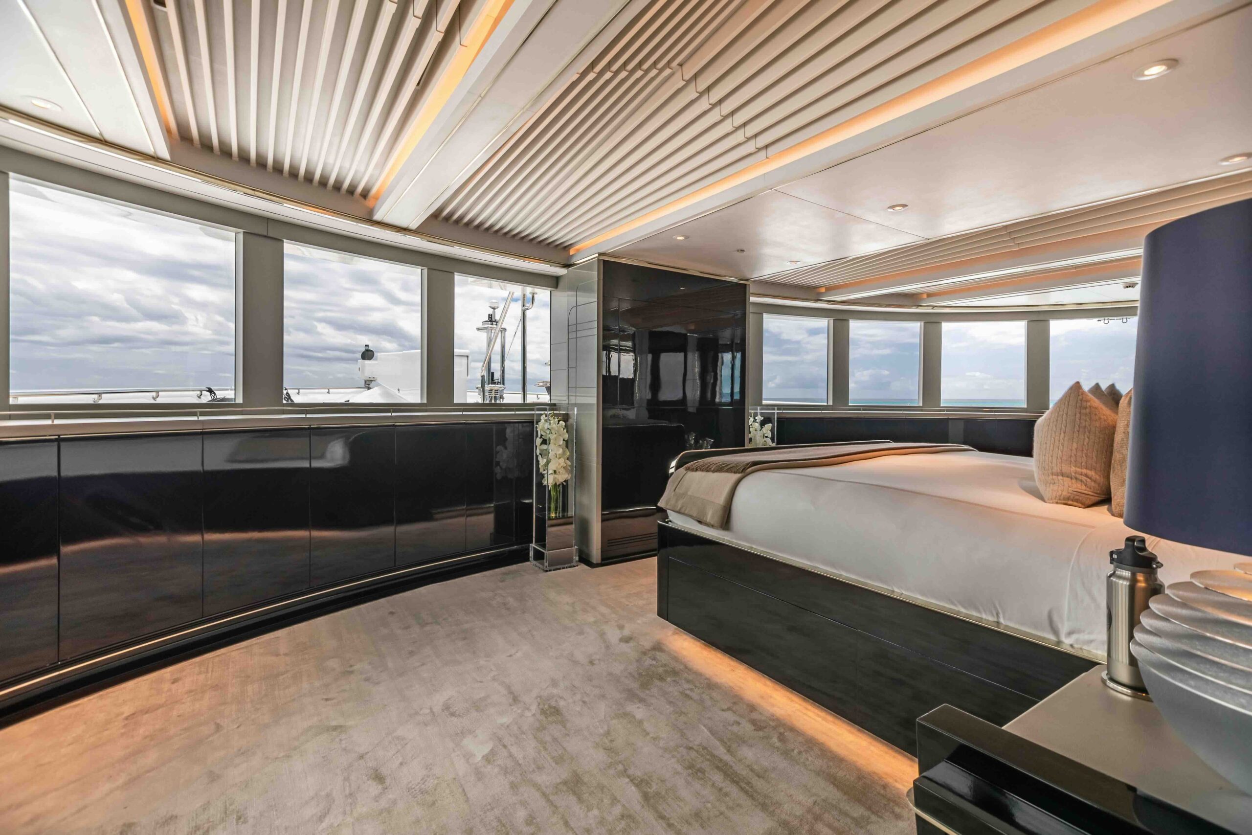 The magnificent Amalfi Master Cabin is situated on the main deck and offers an unrivaled sense of luxury and space. This split-level suite features a king-size bed with plush linens and boasts 180-degree panoramic views from its high-set windows, providing breathtaking vistas of the ocean. Guests will enjoy a walk-in dressing area and an en-suite Grigio Carnico marble bathroom with a large soaking tub and rain shower. Every detail, from the custom furnishings to the opulent finishes, creates a sanctuary of elegance and comfort, perfect for unwinding after a day of exploration